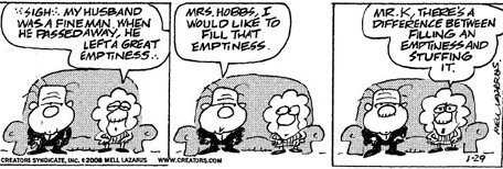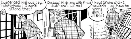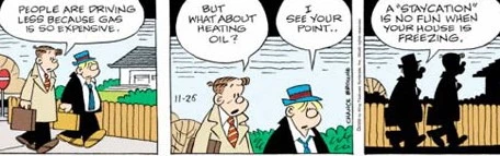 With the recent worldwide economic crisis, many comics have started striving for more topical humor, although they seem to have left out the "humor" part. Especially hard hit were Hi and Lois, Lois having been in the real estate business since 1980. That led to this scene where Hi comes home to tell the children that not only will they not be going to Grandma's this winter, but that there's a pretty good chance they'll all be frozen to death by Christmas.