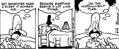 At 90 years old, "Gasoline Alley" is only slightly younger than the average comic strip reader. In this laugh-a-minute installment, one of the characters considers how much better his life would be if he were dead, rather than in the throes of crippling debt.