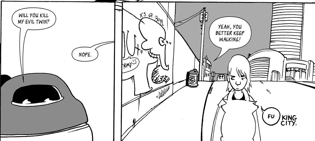 The city comes off as a tangled amalgamation of everything Graham enjoys in life. There are subtle and overt references to other properties, such as when "Optimus Prime Roast" comes up in one panel partway through the series. That diversity of content and location makes the city feel weird, but real. It's a descendent of every city anyone ever lived in, simultaneously terrifying and comfortable. Danger lurks around every corner, but you shouldn't be afraid, because love does, too. King City is like real life.
