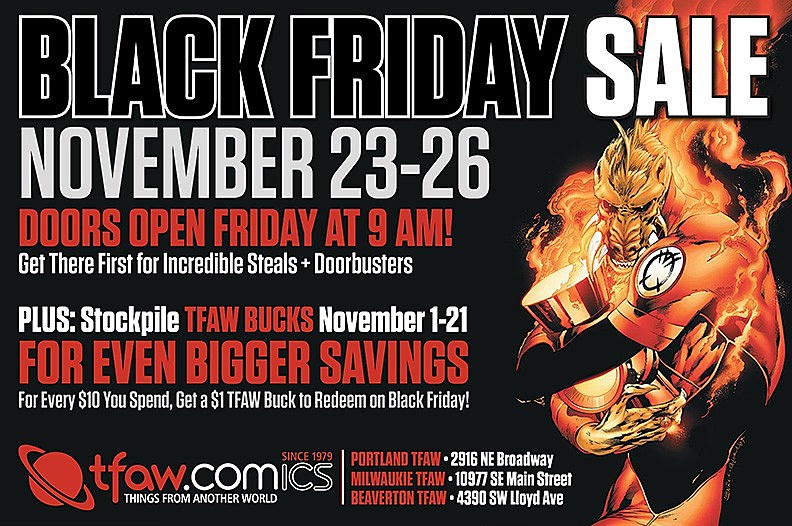 For many Americans, the Thanksgiving holiday is a time of blessing and gratitude that facilitates the coming together of friends and family both close and disparate to break bread, reflect upon their lives and relationships with one another, and to contemplate the depths of their unspoken disdain. For other Americans, like me, Thanksgiving is all about Black Friday. The busiest shopping day of the year comes with bargains accurately advertised as "insane," and they're to be found in virtually every dimension of the retail universe. It's the ideal time of year to fill the deep, dark holes in our souls with material goods that reflect or enhance our personal brands and lifestyle idioms, and you can believe comic book merchants are getting in on the action.