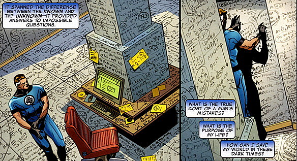 Idea #101 references the 100 ideas Reed, Hank Pym and Tony Stark came up with during the initial stages of Civil War -- for instance, the Negative Zone prison was idea number 42. The room itself that he's in, the gigantic Room of Ideas, was first kind of glimpsed in a panel in Civil War #2 but really introduced in Fantastic Four #542 as Reed's intellectual sanctuary, a room of all whiteboards -- floors, ceilings, walls -- where he can surround himself in conceptualization.