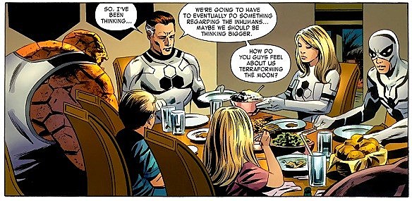 Pages 22-23: The Inhumans that Reed brings up at dinner were, at their introduction, a group of people on Earth who had been experimented on by the alien Kree. At around puberty, they would use the "Terrigen Mists" to transform and become their "Inhuman" self, which usually had some kind of badass superpower. At this point they've gone into space to take over Hala, the Kree homeworld, but back in F4 #577 Hickman established that the Kree had actually performed this experimentation on four other cultures in the galaxy, and now they're all living on a city on the moon, waiting for the lost King of the Inhumans, Black Bolt, who fell into an interuniversal Fault at the end of Dan Abnett, Andy Lanning and Paul Pelletier's War of Kings event.