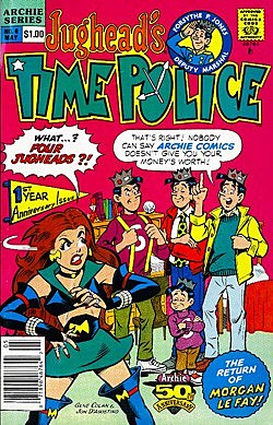 For those of you who have never read it, Jughead's Time Police was a product of the same strange era that started with the abominable New Archies and gave us books like Archie 3000 -- in which the same old stories about Archie's car breaking down on the way to a date with Veronica at the prom were replaced with stories about Archie's robot jet car breaking down on the way to the space prom -- and the truly amazing Archie's Weird Mysteries, in which Riverdale was constantly plagued by Draculas and Wolfmans. Thanks to his sleepy-eyed nonchalance around everything that wasn't a hamburger, Jughead was a pretty good foil to bounce this stuff off of, so he was right in the center of it.