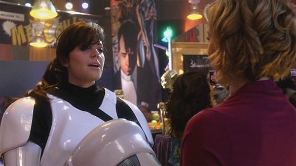 David: This guy looks like a child molester, but only Chloe gets the honor of possibly molesting a child this episode. As the kid is running out with the comic he stole -- so he can read it in the bathroom, not scan it for the world like a proper Internet archivist -- he bumps into the least sexy Erica Durance costume ever, as she's "embedded" at a comic convention with Chloe and dressed like a Stormtrooper.