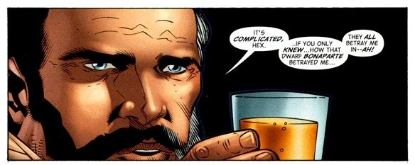 The "Monsieur Savage" is, of course, Vandal Savage (from #1!), who's apparently recovering about 60-70 years later from getting stiffed by Bonaparte. The Napoleon references really threw off my estimation of this issue's setting in time by a bunch; I figured it was fairly recently after, 1820 or 1830 or so, but Hex's entire origin is the Civil War, so this has to be more like 1870-1880, especially to line up with the dates Greenberger gives in the Batman Encyclopedia regarding the building of Wayne Manor.