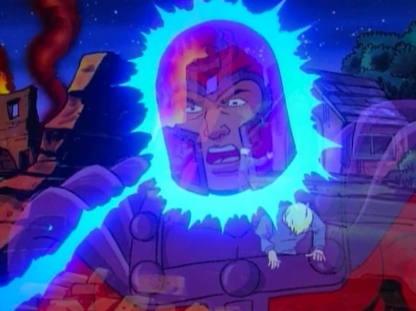 From this point on, Magneto just basically smacks the X-Men around for a few minutes, including a weird moment where they choose to show him zapping Storm with magnetism and then magnetisming a brick wall down on top of her. As she's covered in rubble, we get our first taste of Storm's crippling claustrophobia, as represented by some truly hilarious voice-actor screams. There's a weird dip in the middle like she's losing interest in screaming and then remembers what she's doing, and I encourage you all to go listen. It's worth it.